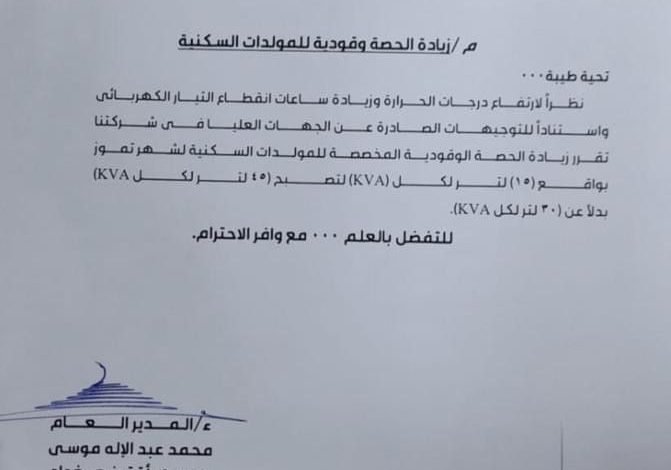 عااااجل :شركة توزيع المنتجات النفطية تقرر زيادة الحصة الوقودية المخصصة للمولدات السكنية نظرا لارتفاع درجات الحرارة…