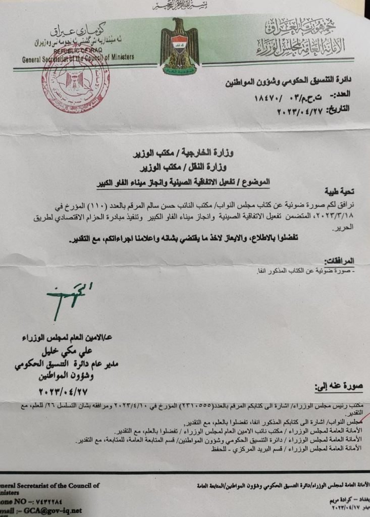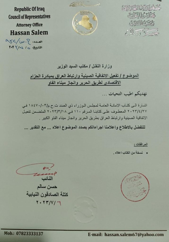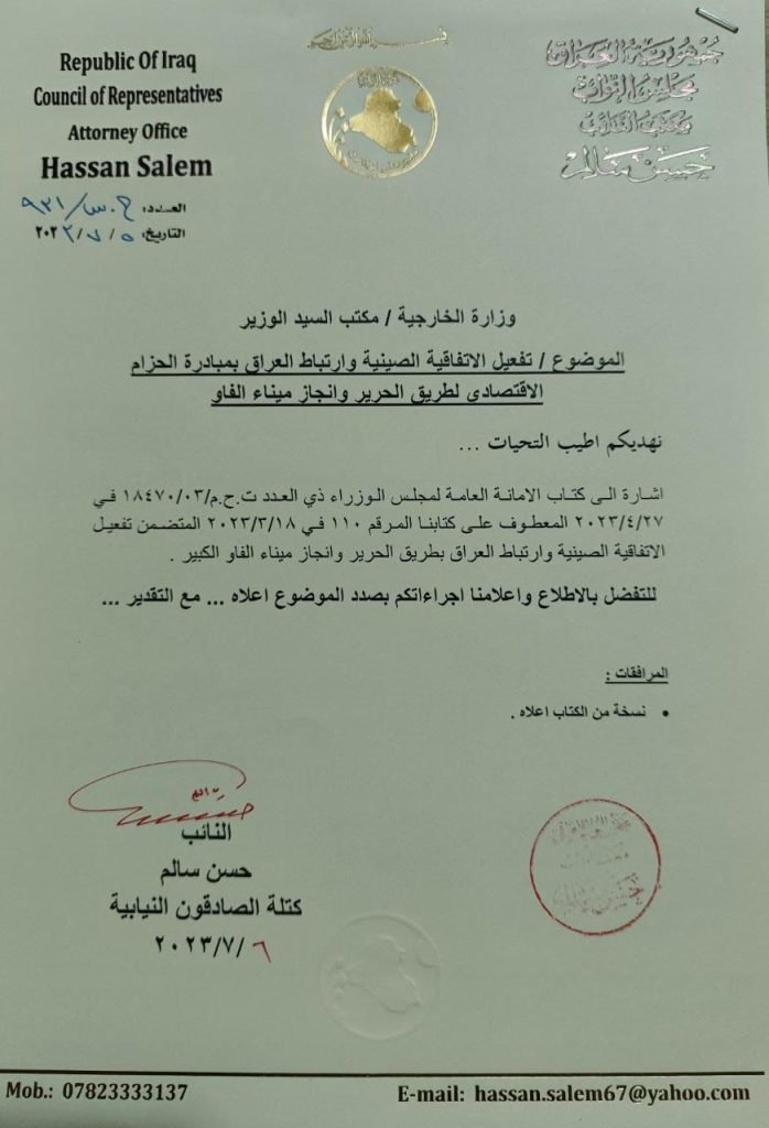 خاطب النائب حسن سالم وزارتي الخارجية والنقل بتنفيذ مضمون كتاب الامانة العامة لمجلس الوزراء ذي العدد ت.ح. م / 03/18470 في 2023/4/27 والمعطوف على كتاب مكتبنا ذي العدد 110 في 2023/3/18 والمتضمن ( تفعيل الاتفاقية الصينية وسرعة ارتباط العراق بمبادرة الحزام الاقتصادي لطريق الحرير وانجاز ميناء الفاو)*
