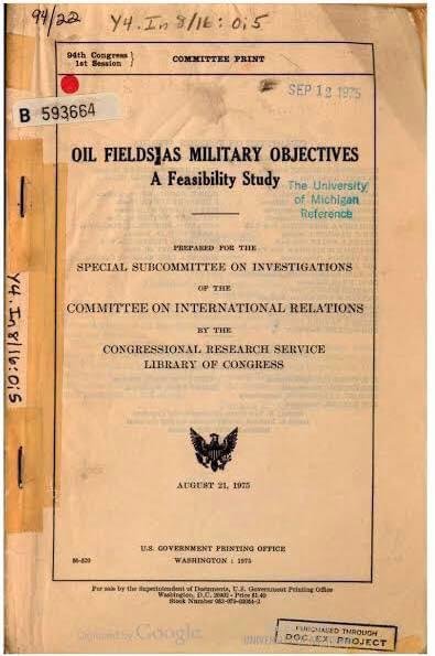 لقد ظهرت فكرة الاستحواذ على حقول النفط العربية إلى العلن منذ عام 1973 للرد على قرار أعضاء منظمة البلدان العربية المصدرة للبترول (أوابك) بفرض حظر نفطي على الولايات المتحدة، فكان ذلك القرار نقطة التحول التاريخية. فعلى الرغم من رفع الحظر المفروض على الولايات المتحدة في مارس 1974، إلا أن واشنطن تبنت مذاك خطة مستقبلية جادة انبرى بإعدادها الكونجرس الأمريكي عام 1975، تناولت دراسة جدوى التعامل مع حقول النفط كأهداف عسكرية في المنظور الحربي الاستراتيجي. .
