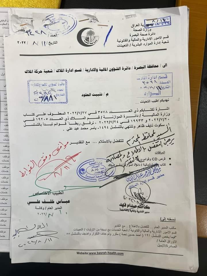 وافقت الحكومة المحلية في البصرة على تثبيت الموظفين العقود في دائرة صحة البصرة على الملاك الدائم”.