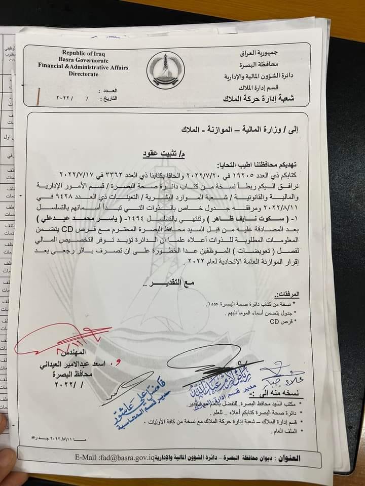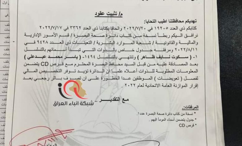 وأفاد المكتب الإعلامي في بيان الى موافقة النائب الأول لمحافظ البصرة المهندس ، محمد طاهر التميمي ، في الكتاب الموجه من قبل الحكومة المحلية الى وزارة المالية على تثبيت الموظفين العقود في دائرة صحة البصرة ممن لديه خدمة عقد فعلية سنتين فما فوق بتثبيتهم على الملاك الدائم “.