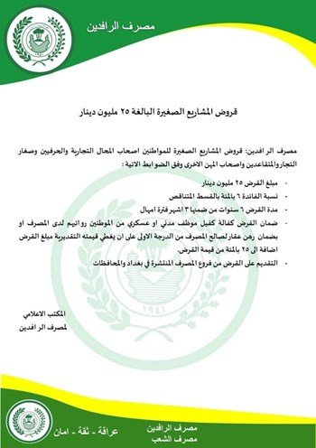 الرافدين يصدر التعليمات الخاصة بتمويل قروض المشاريع الصغيرة