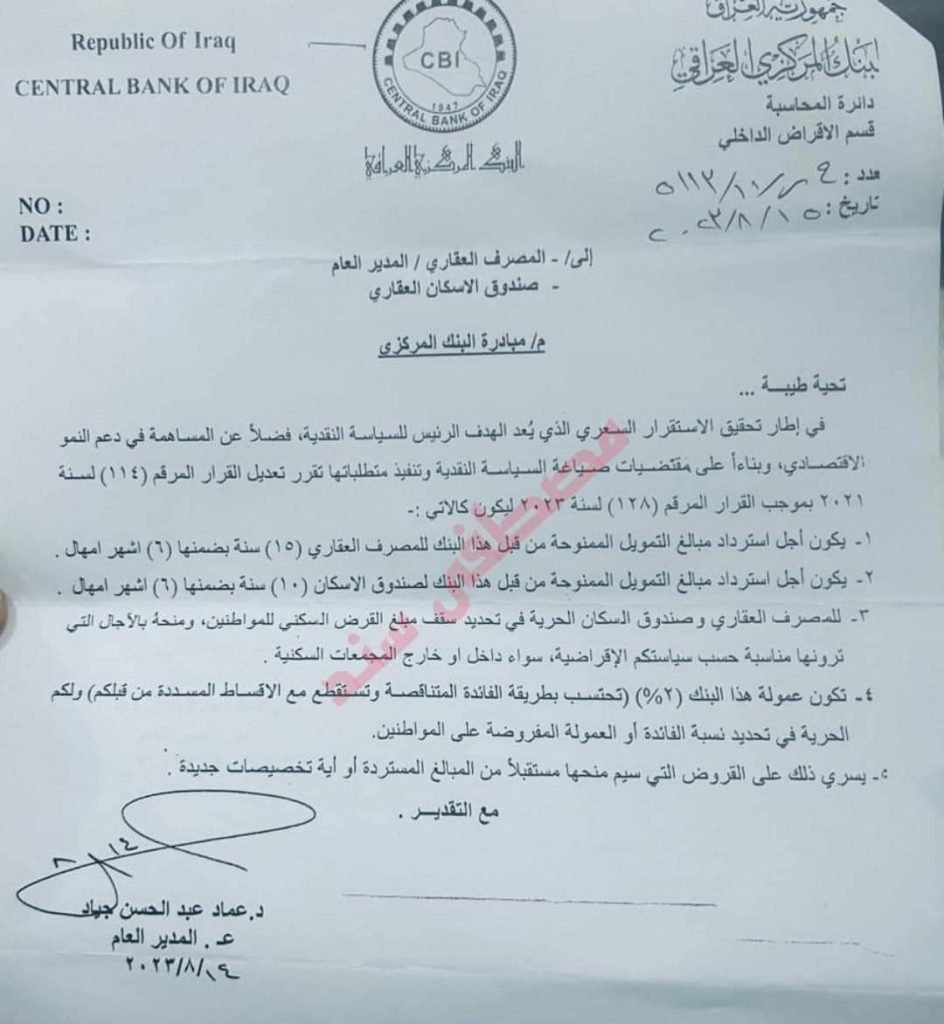 محافظ البنك المركزي أعلن تخصيص مبالغ مالية للمصرف العقاري وصندوق الاسكان بهدف تحقيق النشاط الاقتصادي واطلاق المبادرة