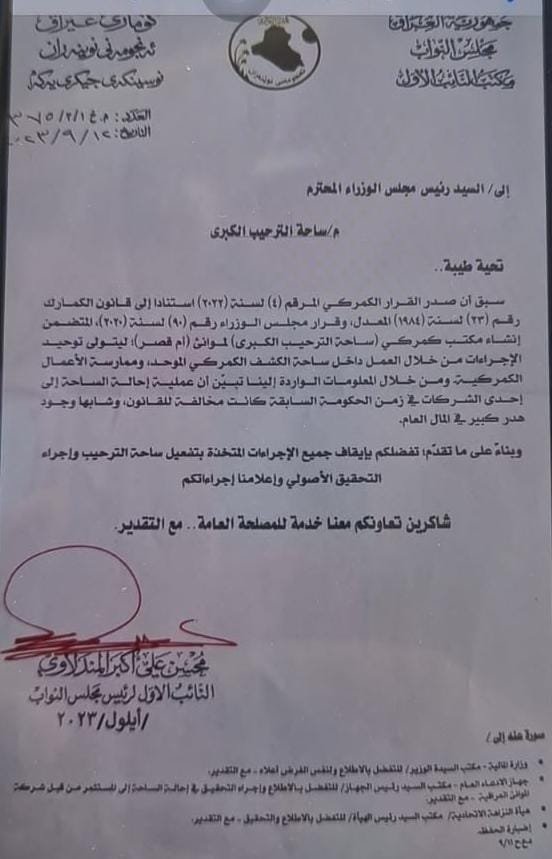 وجه السيد رئيس مجلس النواب محسن المندلاوي كتاب الى السيد رئيس مجلس الوزراء حول ساحة الترحيب الكبرى واحالتها في زمن الحكومة السابقة على احدى الشركات ويشوب ملف احالتها حالة فساد ومن المعلوم ان البلدان تتميز بإفتتاح مشاريع وتسليط الضوء على منجزات متنوعة بالعلوم والفنون بينما يتميز العراق بأغرب قصص الفساد وهدر المال العام .!
