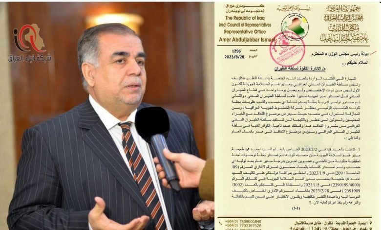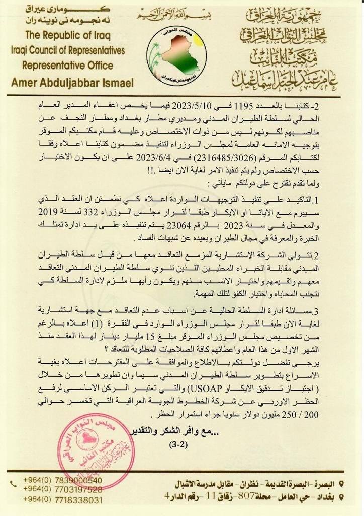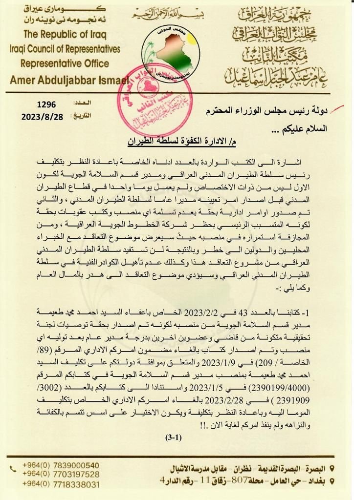 ⭕️ نائب عراقي يطالب رئيس الوزراء باقالة مدير عام سلطة الطيران المدني ومديري مطار بغداد والنجف كون مواصفاتهم تخالف ضوابط المنظمة الدولية للطيران المدني ICAO