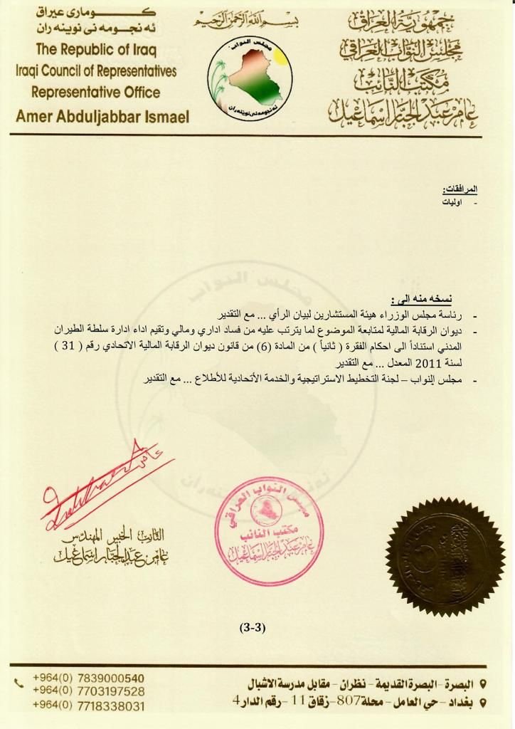 ⛔️ لهذه الاسباب حذر النائب الخبير المهندس عامر عبدالجبار اسماعيل رئيس كتلة تجمع الفاو زاخو و وزير النقل الاسبق من استمرار مسلسل الحوادث والخروقات في مطاراتنا وطائراتنا وأجوائنا دون أي اجراء من رئيس مجلس الوزراء حتى وقوع الكارثة الكبرى لاسمح الله حينها لا تنفعك الندامة يا دولة الرئيس‼️ لانك ستكون المسؤول الاولى امام القضاء العراقي وجميع خطاباتنا لكم موثقة وفيها تحذيرات متكررة دون اي اجراء من قبلكم ‼️