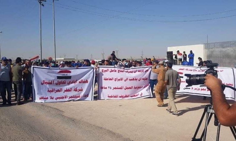بالصور .. موظفي شركة الحفر العراقية يتظاهرون في البرجسية امام مقر الشركة للمطالبة بحقوقهم واقالة وزير النفط