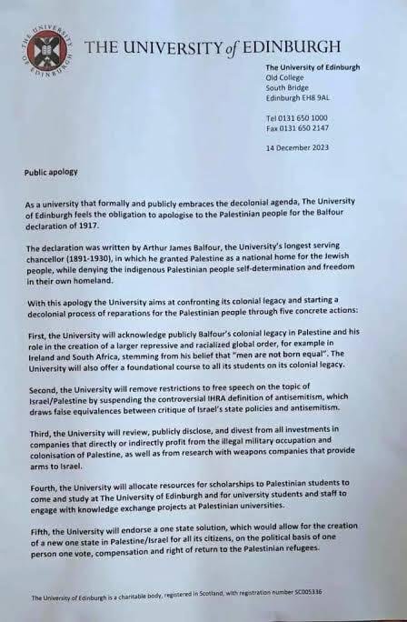 تأسست جامعة ادنبرة قبل تأسيس كيان الدولة المحتلة بنحو 365 سنة، أي قبل ولادة كبير الصهاينه الذي علمهم السحر (تيودور هرتزل) بنحو 277 سنة. وهي الآن تتقدم باعتذارها إلى الفلسطينيين كافة، بوثيقة (غير رسمية) لكنها وثيقة دامغة، تطرح فيها حزمة من الحقائق المبنية على الوقائع العلمية والتاريخية والسياسية، وتنسف فيها مقومات بقاء الكيان المسخ، وتعيد الحق إلى أصحابه، وتحرج القوى الدولية الغبية اللاهثة وراء سراب التوسع الصهيوني، وتصحح المفاهيم المغلوطة لدى الرأي العام العالمي من خلال تسليط الأضواء على الحقائق المغيبة. .