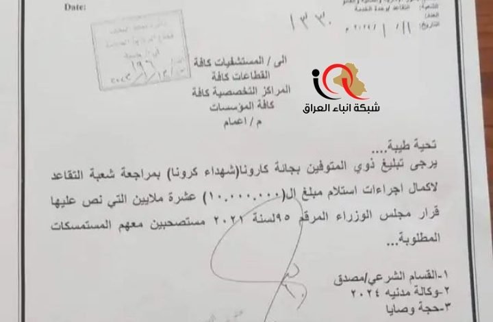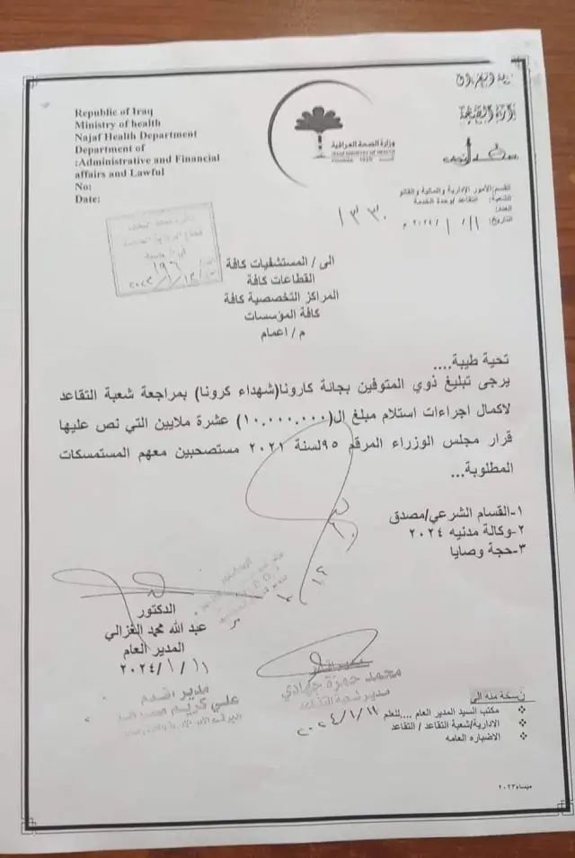 وزارة الصحة تدعو ذوي المتوفين من الكوادر الصحية والتمريضية {الجيش الأبيض} الى المراجعة لاستلام مبلغ الـ 10 ملايين دينار التي خصصها مجلس الوزراء سابقاً .