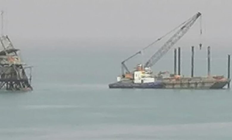 صورة التقطتها السفن العراقية يوم الثلاثاء الموافق ٢٠ / ٤ / ٢٠٢١ لمدخل شط العرب من جهة البحر، حيث تظهر سفينة إيرانية لدق الركائز في مهمة جديدة لتثبيت دعامات حدودية، وبناء محطة ملاحية وساحلية، لا تبعد كثيرا عن ميناء خور العمية النفطي. .
