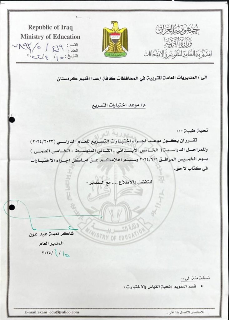 وقالت الوزارة في بيان ، إن “المديرية العامة للتقويم والامتحانات حددت السادس من حزيران المقبل موعدا لإجراء اختبارات التسريع للعام الدراسي ٢٠٢٣_٢٠٢٤ للمراحل الدراسية ( الخامس الابتدائي والثاني المتوسط والخامس العلمي)”.