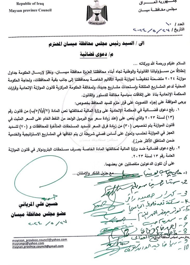 واشار ” المرياني الى انه جمع تواقيع تسع  أعضاء في مجلس محافظة ميسان مؤيدين الى مطلبه برفع الدعوى القضائية ضد وزارة المالية .
