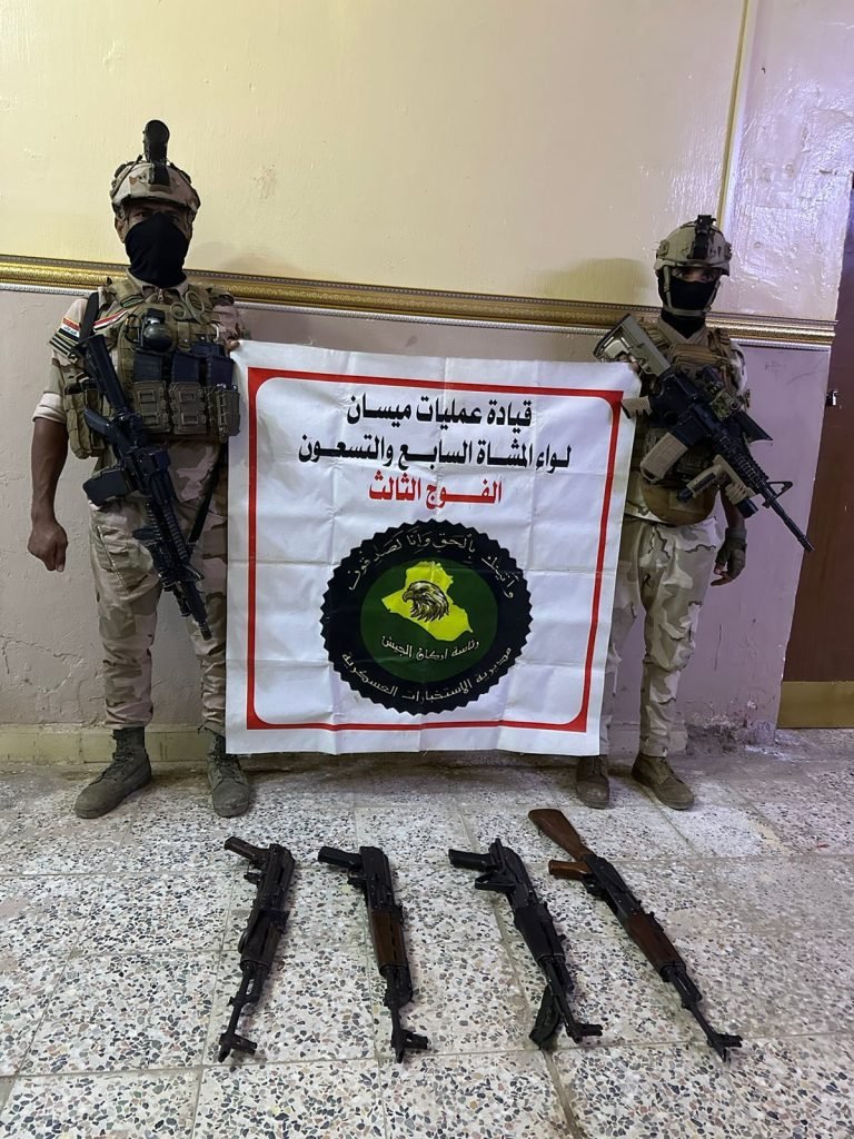 قيادة عمليات ميسان تُلقي القبض على متهمين وتصادر عددً من الأسلحة في قضاءي المجر الكبير وقلعة صالح