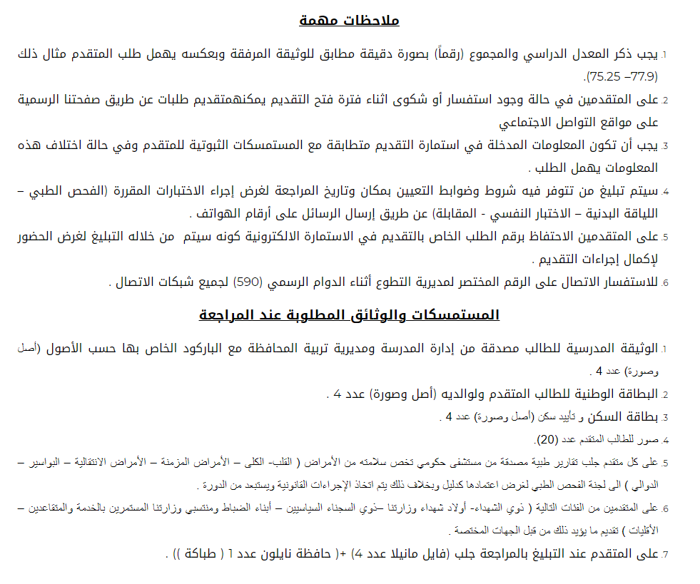 12-على المتقدمين من أبناء الضباط المستمرين والضباط المتقاعدين والمنتسبين المستمرين بالخدمة تقديم ما يؤيد كون والده ضابط أو منتسب في (وزارة الداخلية) وتكون معيار المفاضلة بينهم حسب الرتبة لإبائهم وليس على المعدل الدراسي.