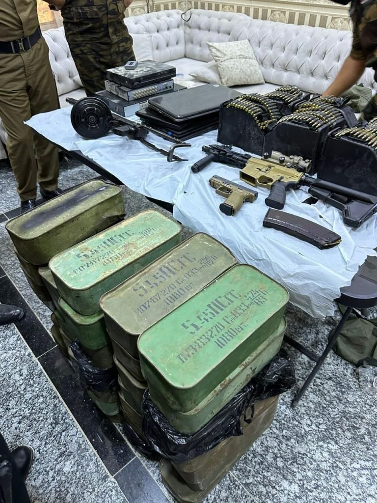 علبة عتاد خفيف عدد(46) علبة عتاد متوسط عدد (37) BkC عدد (2) كلاشينكوف نصف اخمس مقصرة عدد(1) بندقية M4 عدد (1) مسدس 9ملم عدد (2) مع مخازن من نوعه حاسوب لابتوب عدد (4) اجهزة اتصال متنوعة عدد(8) وعجلة نوع تاهو عدد(2)