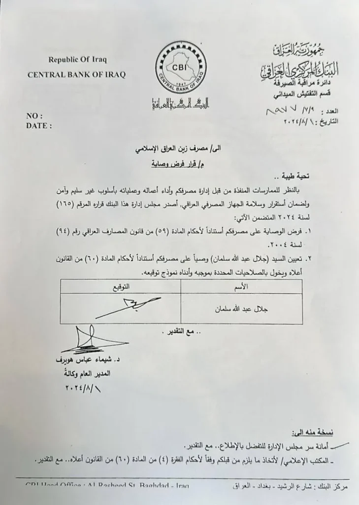 قرر البنك المركزي العراقي فرض وصايته على مصرف زين العراق الإسلامي، بسبب ما وصفه بـ”الاسلوب غير سليم”.