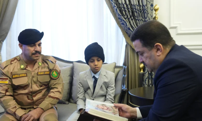 وذكر مكتبه الإعلامي، في بيان ، أن “السوداني استقبل اليوم، الطفل اليتيم المصاب (عبد السلام) وهو من ضحايا الإرهاب البالغ من العمر 9 سنوات، يرافقه المواطن السيد منهل أحمد عكلة، المتكفل برعايته، وهو أحد منتسبي الجيش العراقي، بعد أن أنقذه خلال معارك تحرير الموصل، وأنقذ عدداً آخر من الأطفال”.