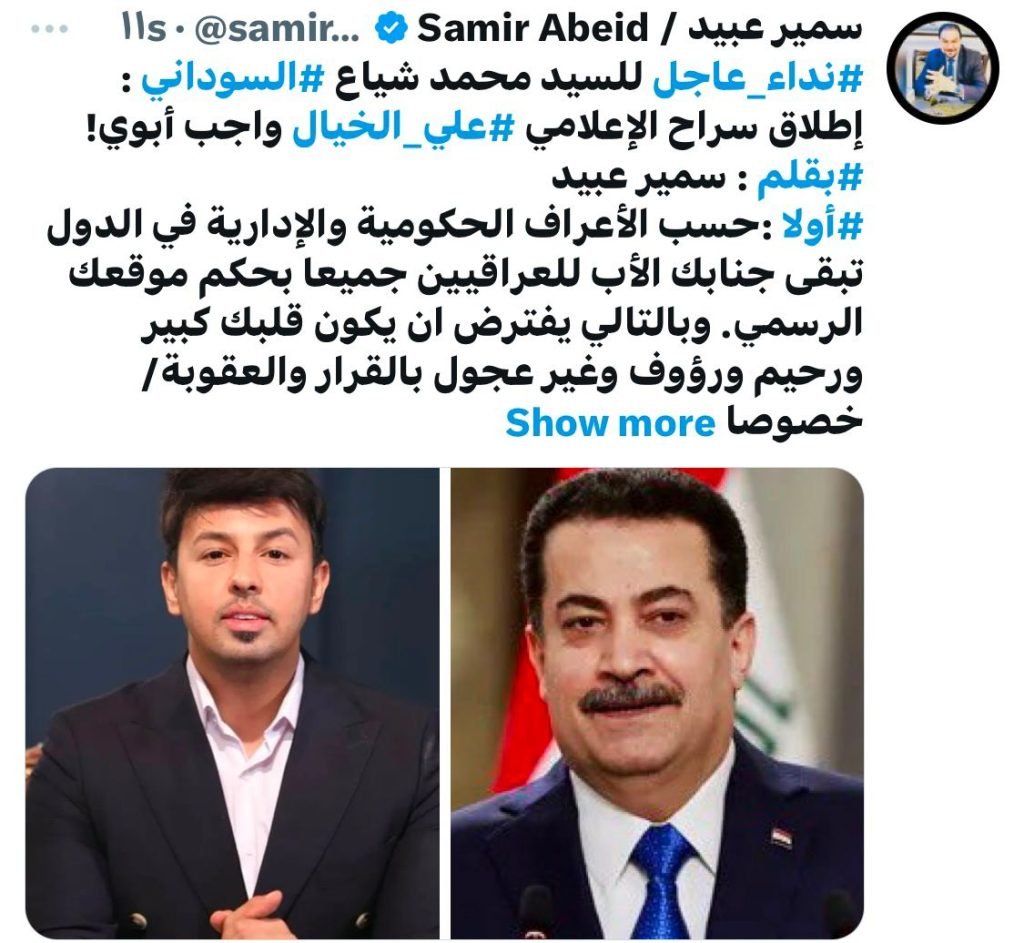 نداء عاجل للسيد محمد شياع السوداني : إطلاق سراح الإعلامي علي الخيال واجب أبوي!