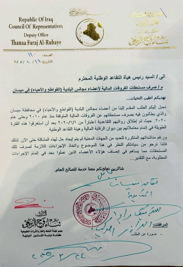 في استجابة لجهود النائب ثناء فرج الربيعي، وجه رئيس هيئة التقاعد الوطنية تعليمات إلى مديرية تقاعد ميسان بضرورة التدقيق واتخاذ الإجراءات العاجلة لصرف الفروقات المالية المستحقة لأعضاء مجالس البلدية (القواطع والأحياء) عن الفترة الممتدة من عام 2010 إلى 2020.