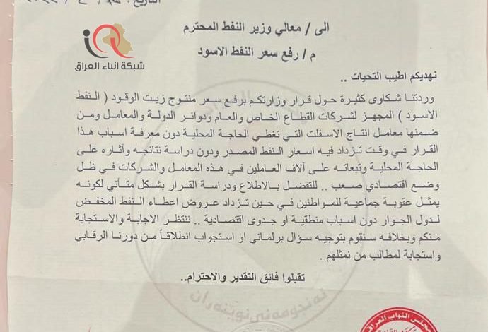 بالوثيقة.. النائبة دكتورة حنان الفتلاوي تطالب وزير النفط بضرورة تخفيض سعر النفط الأسود المجهز الى معامل الأسفلت المؤكسد الى (150 الف دينار) بدلاً من (350 الف دينار) بسبب الأوضاع الاقتصادية الخانقة الدعم الحكومي للقطاع الخاص.