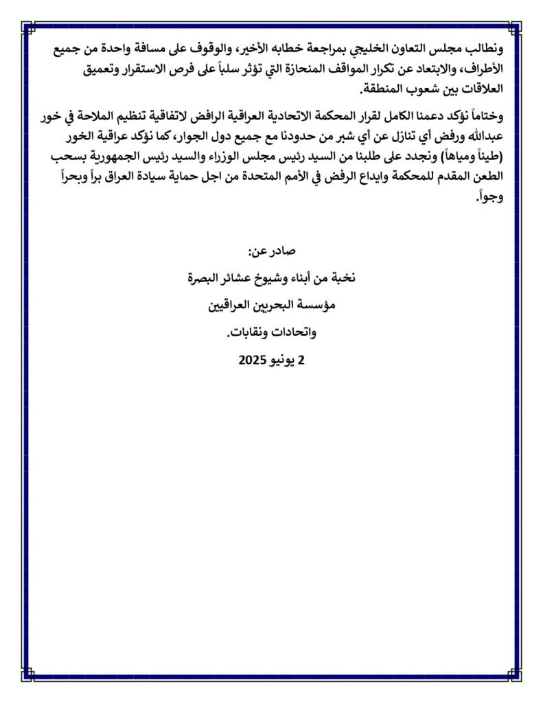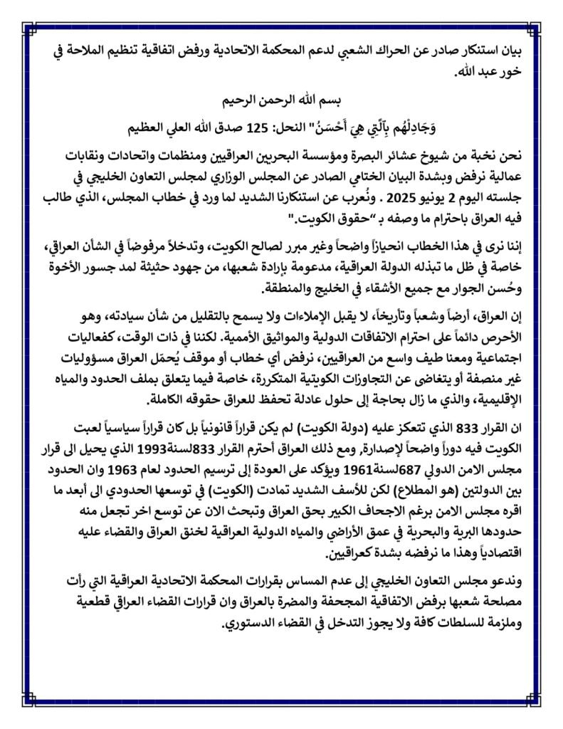 بيان استنكار صادر عن الحراك الشعبي لدعم المحكمة الاتحادية ورفض اتفاقية تنظيم الملاحة في خور عبد الله