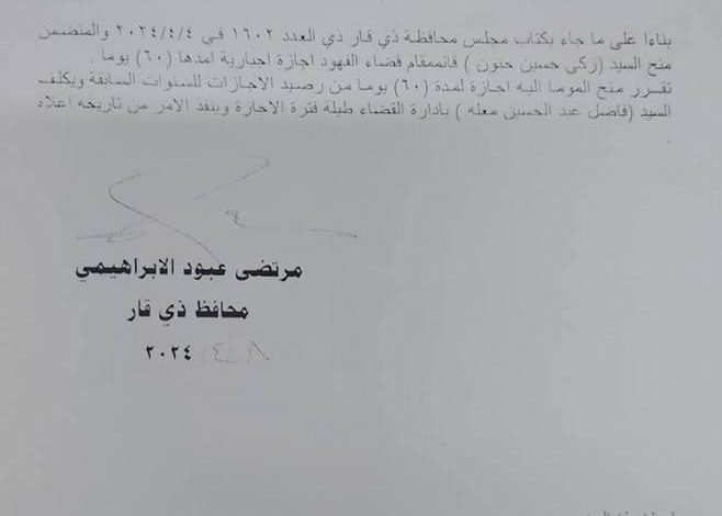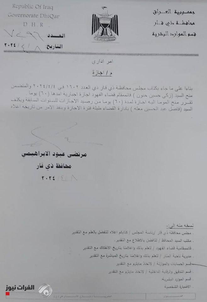 بالوثيقة.. محافظ ذي قار يمنح قائممقام الفهود إجازة إجبارية ويكلف بديلاً عنه