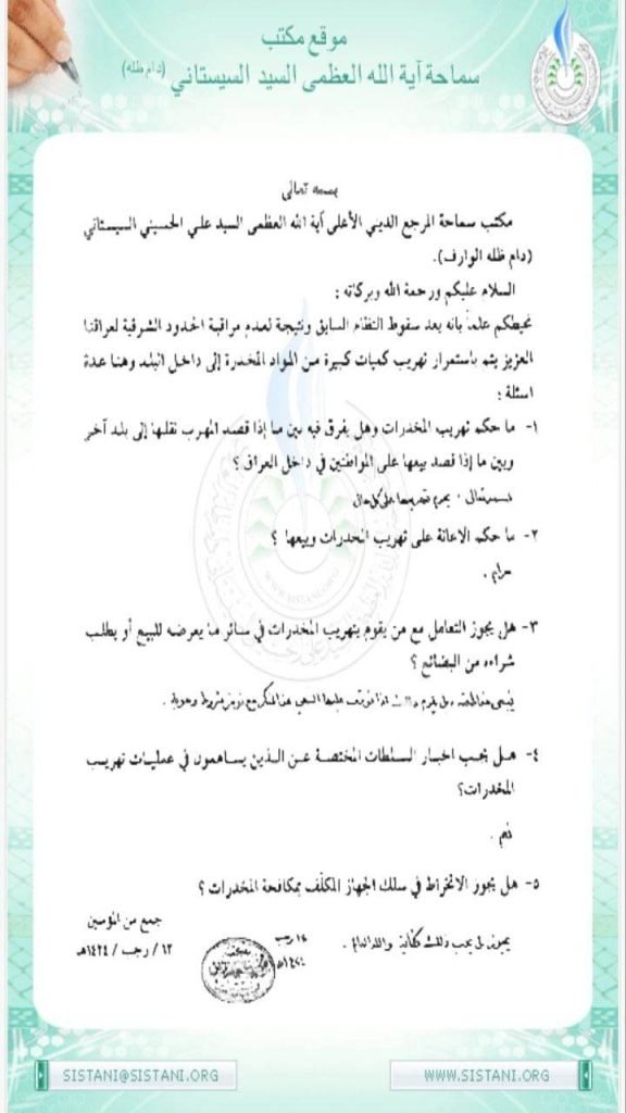 قبل عشرون عاما وتحديدا في الثاني عشر من شهر رجب من العام الهجري (1424) اي في العام (2003) ميلادي اصدر مكتب المرجع الديني الاعلى السيد علي السيستاني مجموعة استفتاءات ترد على أسئلة موجهة تخص المخدرات وضعف السيطرة على الحدود وتهريبها الى العراق وما حكم تهريبها سواء الى داخل العراق او لغرض نقلها الى بلد آخر وكان الجواب (يحرم تهريبها على كل حال) وهو نسف وتحريم لكل تجارة المخدرات، والحقها بالجواب على حكم من يعين على تهريبها بـ(حرام)، ولم يكتفي بذلك بل اجاب عن جواز التعامل مع من يهرب المخدرات ويعرض بضائع اخرى غيرها للبيع بالرد (ينبغي مقاطعته، بل يلزم ذلك اذا توقف عليها النهي عن المنكر مع توفر شروط وجوبه)، وعن التطوع في سلك الجهاز الامني المكلف بمكافحة المخدرات اجاب (يجوز ذلك بل كفاية)، كما لم يجوز تعاطيها وحكم على الاموال التي تجنى من تجارتها بالحرمة بجوابه (هذه الاموال سحت ولا يجوز التصرف فيها بل يجب ارجاعها الى اصحابها ان عرفهم وإلا تصدق بها على المستحقين من الفقراء)، واوجب كذلك اخبار السلطات عن الذين يساهمون في عمليات تهريب المخدرات”