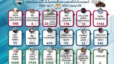 حصيلة الواجبات الامنية والخدمية والانسانية لوكالة الوزارة لشؤون الشرطة وتوابعها في بغداد والمحافظات للفترة من 2023/4/26 ولغاية 2023/5/1