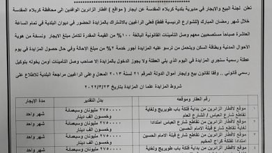 شبكة أنباء العراق … أعلنت لجنة البيع والإيجار في مديرية بلدية كربلاء المقدسة عن إيجار (مواقع) لإفطار الزائرين الوافدين إلى…