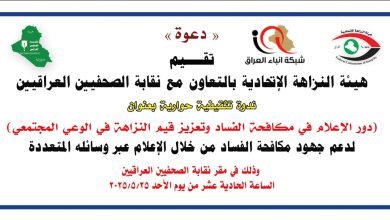 شبكة انباء العراق .. قامت هيئة النزاهة الإتحادية بالتعاون مع نقابة الصحفيين العراقيين ندوة حوارية بعنوان ( دور الإعلام في…